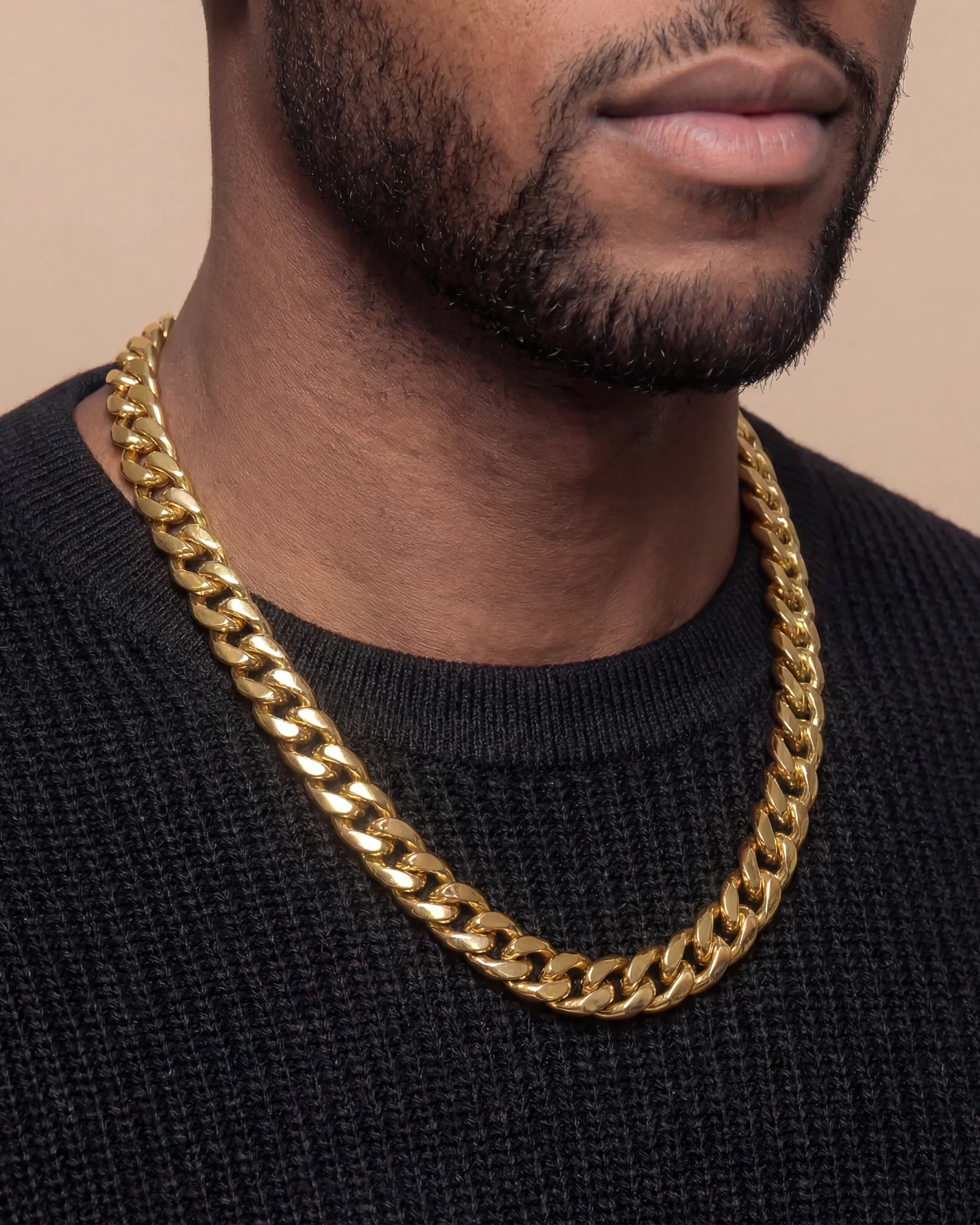 This 12mm gold Cuban chain brings a big, warm shine that instantly boosts your entire fit. It’s a strong statement piece for people who like a standout look.